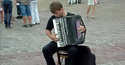 En musiker framför Vivaldis 'Sommar' på ett briljant sätt med sitt dragspel på ett torg i Warszawa.
