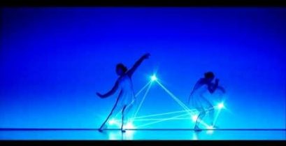 Enra dansgrupp, de japanska dansarna Saya Watatani och Maki Yokoyama synkroniseras med effekterna av ljus som projiceras från en projektor, i 'Pleiades' koreografi.
