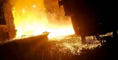 Imponerande syn när smält stål hälls i stål fabrik i Ryssland.