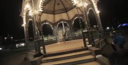 Kasta fyrverkerier på ett ovanligt sätt av dansare Lil Amok i Stuttgart Konigsplatz square.