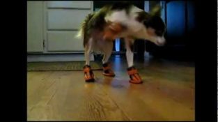 Hundar bär för första gången speciella stövlar för skydd mot förfrysning, och känner dig lite obekväm.