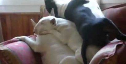 Tre Bull terrier vill sova tillsammans i samma fåtöljen. Hur kommer de att;