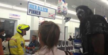 En lång man (2,18m) går shopping klädd som Uruk-Hai