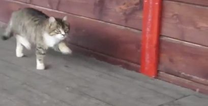 Roliga promenader en katt som liknar en synkroniserad steg parad.