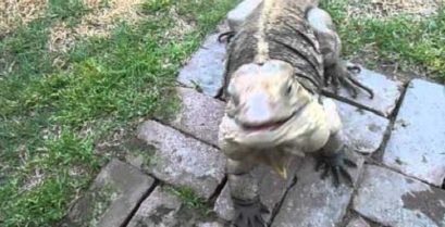 En stor iguana (Staden) beter sig som en hund när ropen ägare.