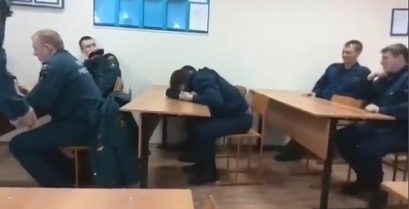 En brandman i Ryssland sovande tid för utbildning. Hans kolleger kommer att göra en mycket rolig upptåg.