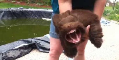 Den lilla hunden Jersey förvandlas till ett monster när han försöker bita i luften från en fläkt.