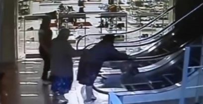 Roliga scenen, med en mormor från Ryssland försöker använda för första gången rulltrappan i ett köpcentrum.
