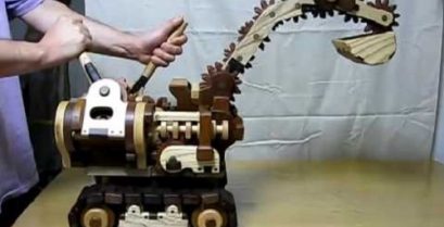 Den japanska ingenjören Kino Iaguruma konstruerat en unik trä grävmaskin modell, Du kan flytta armen med ett smart system av spakar och redskap.