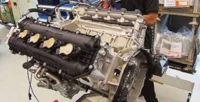 Montering en V8-motor på fabriken av Mercedes-AMG, i Affalterbach, Tyskland.