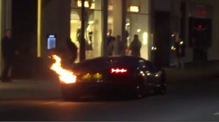 En Lamborghini Aventador från 'Gumball 3000'-loppet ger en liten show för världen i centrala London, När avgassystem lågor som orsakar en liten eld i den bakre delen av bilen.