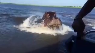 Under en Safari i Zimbabwe, motorbåt förföljd av en flodhäst medan segling på sjön Karimpa. Båten hade att påskynda för att undvika angrepp av de enorma däggdjur, som plötsligt kommer ut [...]