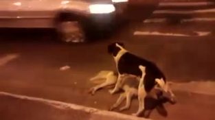 På kanten av en gata i Dublin, Irland, en hund som försöker skydda sin vän som blev påkörd av en bil och verkar döda. Stående ovanpå det så inte att driva ett fordon, [...]