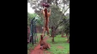 Den vackra hoppa en tiger i ett försök att fånga en bit kött från ett Zoo officiella Glen Afric Country Lodge nära Johannesburg, Sydafrika.
