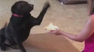 Rolig reaktion av en Labrador, När du erbjuder honom en tårta på sin födelsedag.