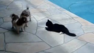 En katt vill lugnt koppla av vid poolen, men två hundar att irritera och bark. Men kattens tålamod är slut och beslutar att agera trycka en av dem inuti poolen.