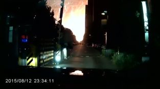 Kameran på instrumentbrädan i en bil in enorma explosionerna som skakade hamnstaden Tianjin, Onsdag 12 augusti, 2015 i Kina. Vi kan se i videon de två blixtarna på himlen [...]