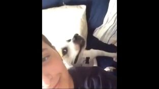 Doggy Nelly vill delta på en selfie umgås med sin chef. När du närmar dig mobila, Nelly poserar vid sättande profil.