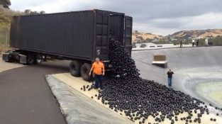 En lastbil dumpar tiotusentals 'skuggbollar' i en vattentank i Los Angeles, Kalifornien. Η εταιρεία διανομής ύδατος “Las Virgenes Water District” χρησιμοποιεί αυτές τις μαύρες μπάλες από πολυαιθυλένιο με διάμετρο περίπου 10 [...]