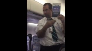 En flygvärdinna i Frankrike visar instruktionerna för säkerheten för passagerare med olika grimaser och roliga gester, på ett plan redo att ta av.