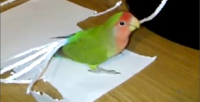 En liten papegoja (Dvärgpapegoja) klipper med näbben några bitar av papper och dekorerar sina vingar.