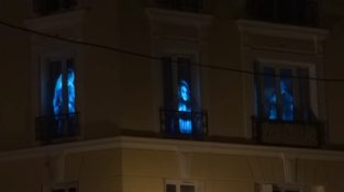 Franska Raymondeau Valentine skapade en skrämmande avbildad vy i Fönstren i sin lägenhet, med anledning av Halloween.