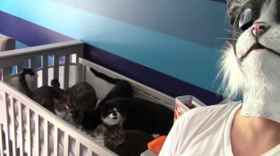 En man ska mata katterna av, bär en katt mask. Felin blir rök när du ser deras ägare skrämmande ansikte.