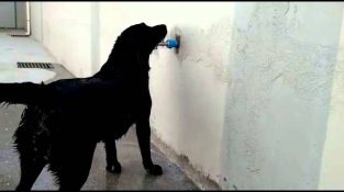 Dära, en kvinnlig Labrador, Öppnar kranen för att göra morgon dusch och kyls av outhärdlig värme i Sao Paulo Brasilien.