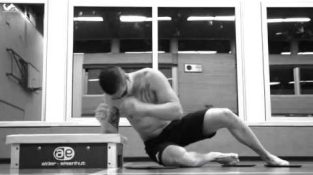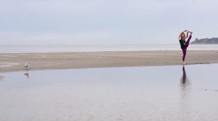 En fiskmås försöker att imitera förehavanden av en kvinna som gör yoga på stranden.