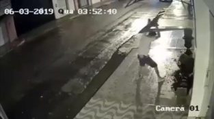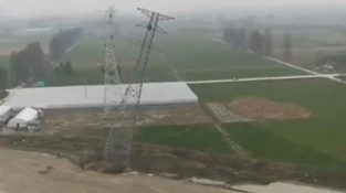 En man kör så fort som möjligt för att undvika en elektrisk pelare faller in på honom. Så småningom, pelaren kollapsar till marken bara en meter bakom honom!