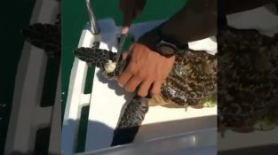 En samling videoklipp där människor hjälper havssköldpaddor, rengöring ostron som fastnat på skalet och kropp.