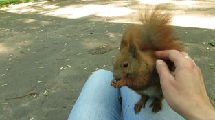I en stadspark i Polen Chorzów, en ekorre kommer att hänga på en kvinna som erbjuder honom några nötter. Bilden och ljudet av parken är hisnande.