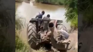 Två bönder över floden Kikowila i Tanzania, gör sin traktor ubåt. I slutet av, De verkar komma ut med sina traktorer igen på den motsatta stranden.