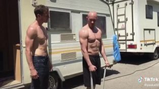En man utövar armarna med en resistiv bälte. En vän berättar att fel träning, och har för avsikt att visa honom hur man gör det rätt.