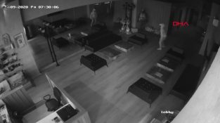 En tjuv in i en restaurang, Han ser sin spegelbild i en stor spegel och körs.