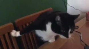 En valp har hittat ett sätt att bli av med katten. Han kommer att linda koppeln runt kattens hals och börja dra.