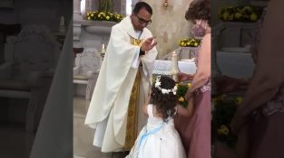 En präst räcker ut handen till en liten flicka för att ge sin välsignelse. Flickan kommer att göra lim fem på prästens hand, något som får honom att skratta.