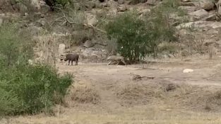 I Kruger National Park i Sydafrika, en leopard försöker överraska en lins genom att långsamt närma sig bakom den.