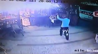 I trädgården på en restaurang i Turkiet, en övergiven katt attackerar en hund och dess ägare.