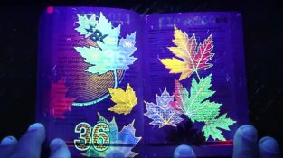 En man öppnar de olika sidorna i ett kanadensiskt pass under svart ljus, som avslöjar vackra ljusa bilder tack vare ett speciellt UV-bläck.