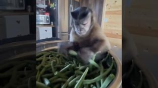 En cappuccino hjälper till med matlagning, bryta bönorna innan du lägger dem i grytan. Han är mycket engagerad i sitt arbete.