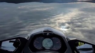 Den helt plana och stilla ytan av vattnet i en sjö, ger intryck av att jetski på den är orörlig.