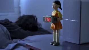 Ett uppvaknande med dockan från spelet ”En, två, tre, sun ”i den sydkoreanska överlevnadsdramaserien” Squid Game ”.