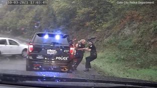 Virginia -polisen i USA har släppt bilder som visar hur polisen Matthew Stewart drar sin kollega Jessica McGraw ur ett fordon som är utom kontroll..