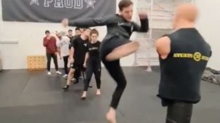En imponerande demonstration av stuntmännen på CUC-skolan (Cascades Universe Campus) i Frankrike, där de en efter en slår en dummy.