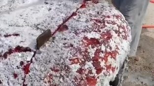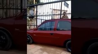 En provisorisk ingångsport, byggd med hjälp av en strimlad bil.