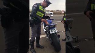Polisen i Brasilien visar oss det illegala registreringsskyltsystemet som de hittade på en motorcykel.