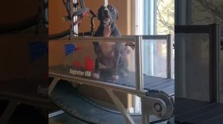En hund väntar ivrigt på att hans ägare ska koppla honom för att springa på ett icke-motoriserat löpband.