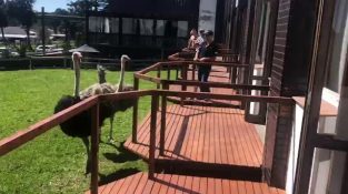 En man ser två strutsar trädgården och kommer ner från balkongen för att köra med dem. Men en av de strutsar kommer att jaga och attackera honom. Den klumpiga man slutar inte [...]