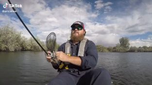En fiskare hatt faller i vattnet, men mannen lyckas fånga det igen med vass av.